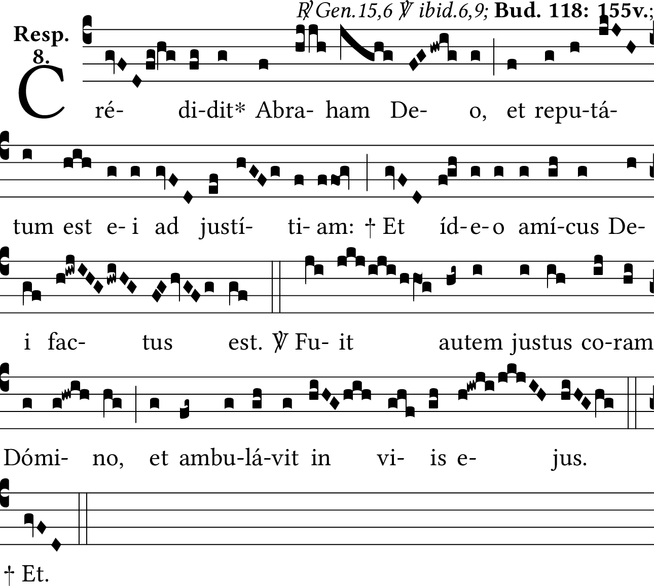 In Sandhofe\'s transcription of this Responsorium, the melody of the response resolves on Fa, which is not typical of Mode 8. Other manuscript traditions (e.g., CH-Fco Ms. 2; D-Mbs Clm 4303) rather show the verse resolving on Sol, which is consistent with Mode 8. Perhaps an early scribal transcription error in Bud. 118: 155v.?
