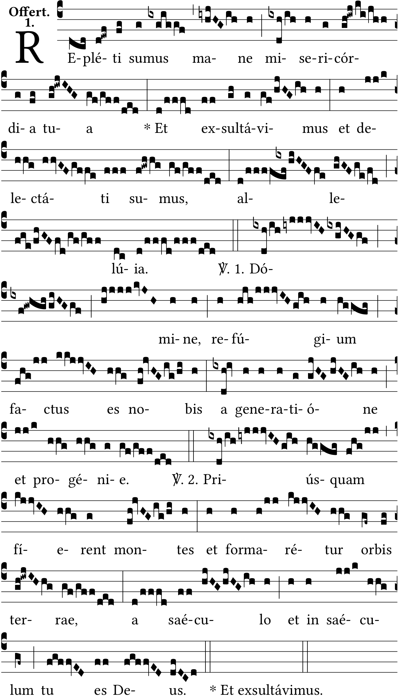 - Oct 19, 2022: refúgium, Allelú{ia}, space :, space after key, unneeded slash space, medium space, removing large space, V. 1. and V. 2., star after bar, removing one colon, adding one note on 'misericórdia', adding one virga on 'Dómine', joining virgas, joining quilismas, changing half bar to full bar, Incipit 'Repleti sumus', Version Offertoriale 1935 (Jacques Perriere) ?