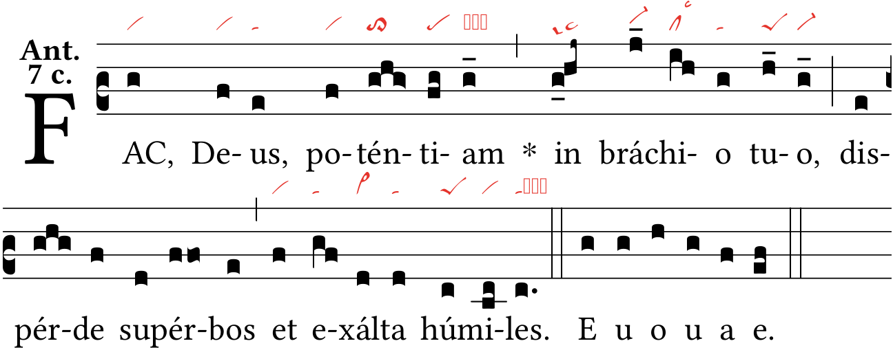 H is a lonely source for this antiphon. The later antiphons inserting "disperde superbos" seem to be inspired by Hartker, but quite modified. Omnigreg proposes a restitution, but I'm not convinced. I give here the restitution as in ARII but with the nabc of H