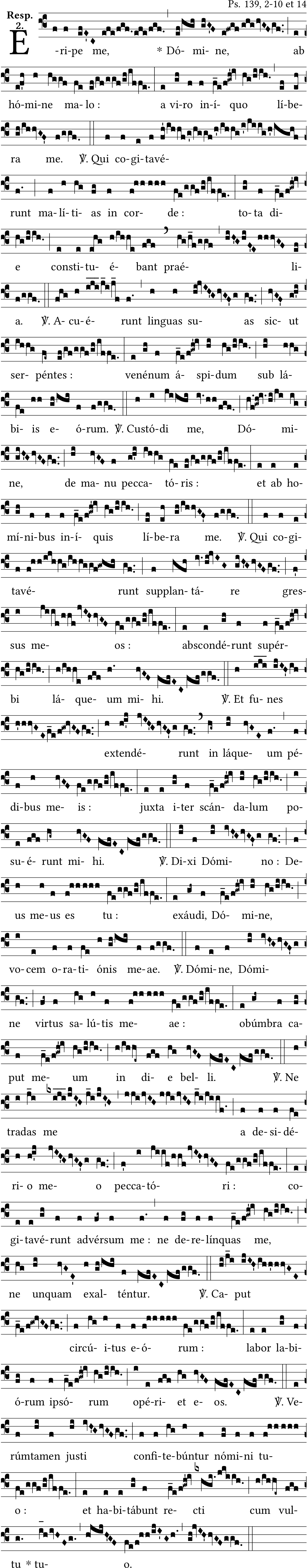 - Mar 25, 2015: Corrected syllable division "in-í-quo","sic-ut", "á-spi-dum", "in-í-quis", ab-scon-dé-runt", "ob-úm-bra", "cap-ut", "i-psó-rum", "ju-sti", "re-cti"; corrected word "ex-ten-dé-runt"; added vertical episema in "ex-áu-di, DÓ-mi-ne"; added punctum mora in "e-os"; added space between notes of "nómini TU-o:". (PDLopes) ?
