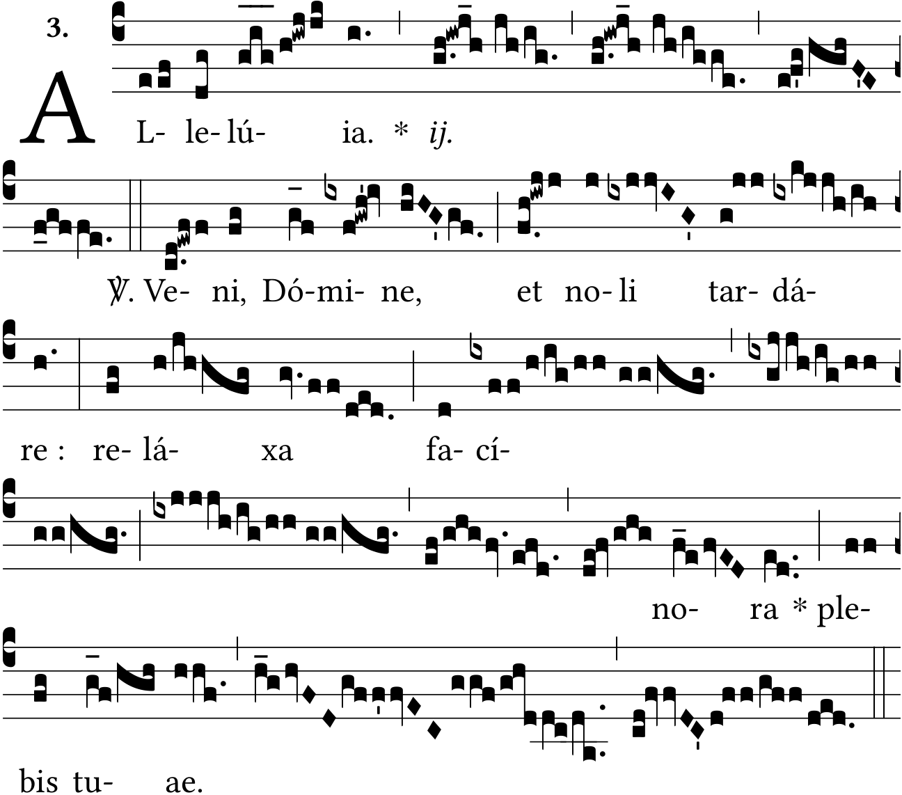 - Aug 24, 2022: unjoining last virga in 'facínora', medium spaces in 'allelúia' and 'tuæ', star after half bar, ij. centering, extending ledger line backward, bars in parentheses, unneeded slash spaces, unneeded zero-width space, adding 1974 and 1990 sources (lvdovicvs) ?