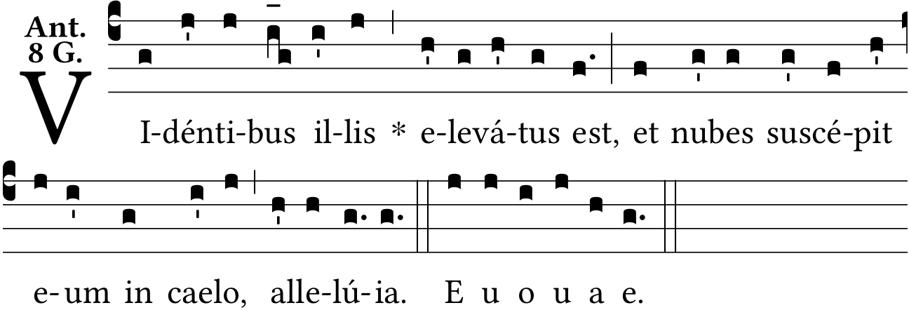 - May 08, 2022: psalm tone 8G, sus-cépit, cælo, Allelú{ia}, raising one episema, Liber Antiphonarius page 492 (Jacques Perriere) ?