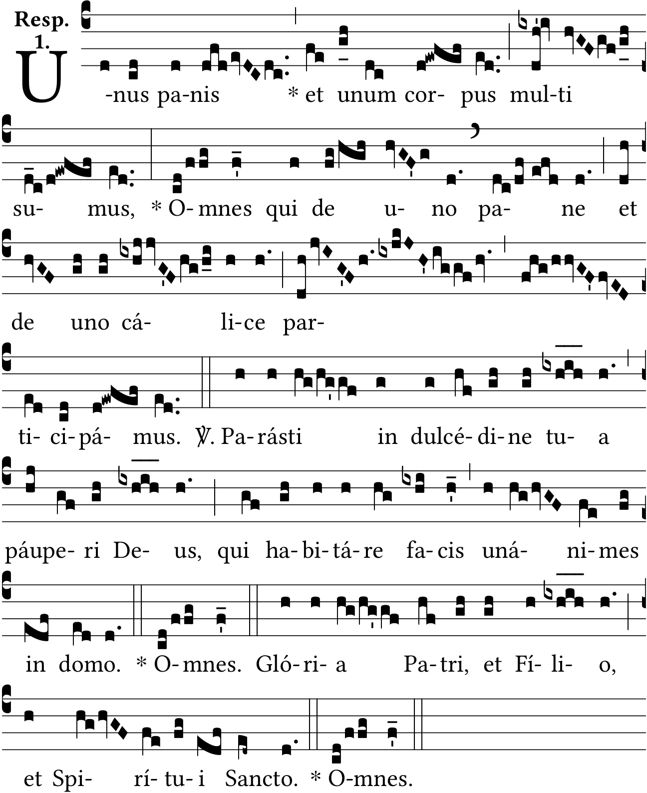 - Aug 12, 2022: u-num, O-mnes, 'uno pane', participámus, un-ánimes, páuperi, removing unnecessary accents, V. after double bar, star after bars, adding star before 'Omnes', ictus before episema, removing one apostrophe at the end, raising and lowering episemas, punctum inclinatum (J) instead of (Js) on 'participámus', adding a podatus (df) on 'pane', lowering one note on the last 'Omnes', Version Solesmes 1957 (Jacques Perriere) ?