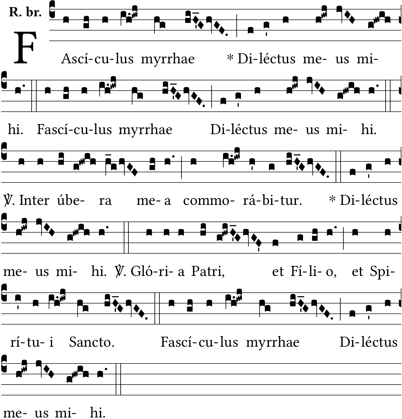 - Aug 30, 2022: FA-scículus, myr-rhæ, Dilé-ctus, 'Inter úbera', San-cto, removing unnecessary accents, adding V., V. after double bar, space after key, space after bars, star after bars, uneeded slash spaces, Version Solesmes 1957 (Jacques Perriere) ?