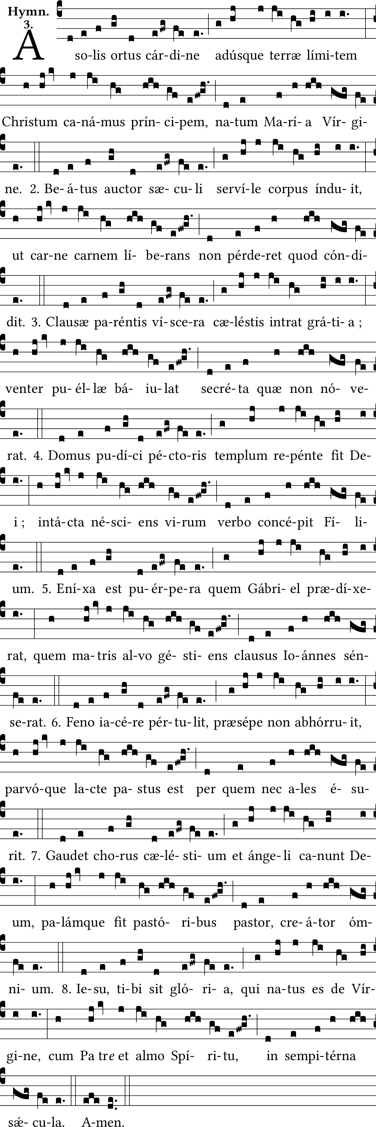 - Dec 30, 2019: Added dots at the end of each measure (per LH); added space between 3rd and 4th notes after full bar line (per LH); restored default spacing between the quilisma-pes and the preceding punctum (2x, LH has some space here); added word accent to saecula; moved vv. 2+ to Hymn Verses field; changed version from 'Solesmes' to 'Solesmes 1983' because text and tune differ from earlier Solesmes versions. (gsmisek) ?