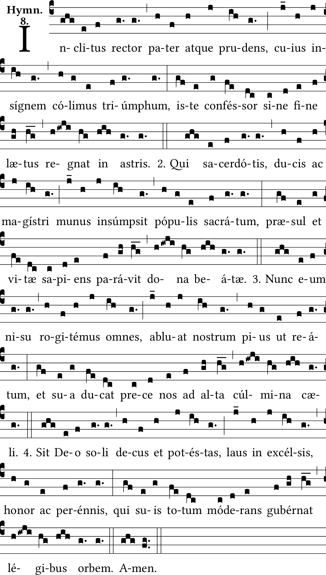 - Aug 02, 2019: Changed incipit 'Inclytus rector' to 'Inclitus rector' and corrected spelling and capitalization throughout to match stated source; restored neumatic break before quilisma-pes, per the source. Moved verses 2-4 to Hymn Verses per site standard. (gsmisek) ?