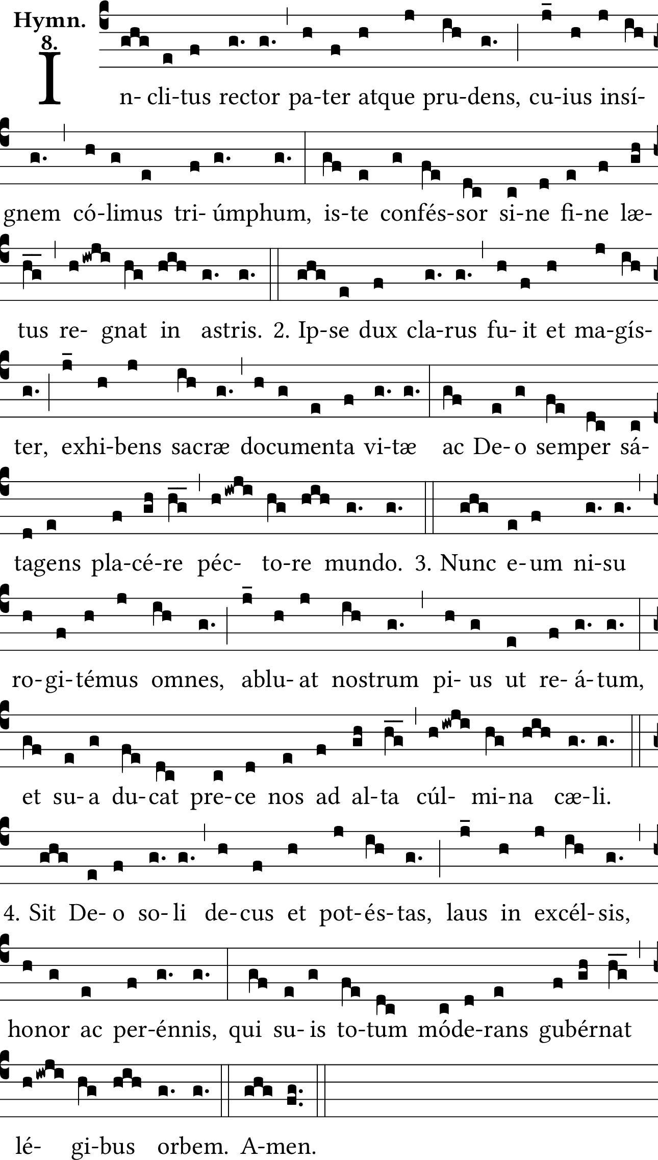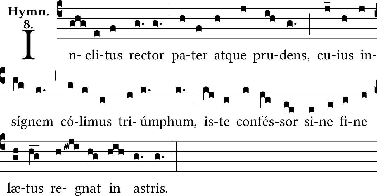 - Aug 02, 2019: Changed incipit 'Inclytus rector' to 'Inclitus rector' and corrected spelling and capitalization throughout and added one comma to match stated source; restored neumatic break before quilisma-pes, per the source. Moved verses 2-4 to Hymn Verses per site standard. (gsmisek) ?